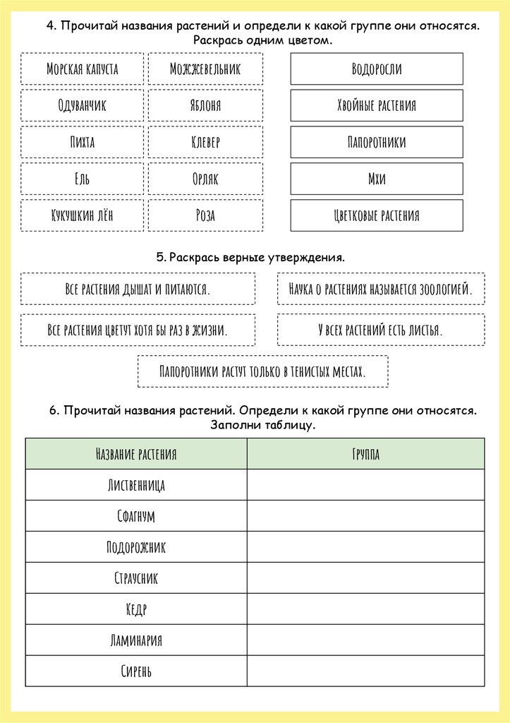 4. Прочитай названия растений и определи к какой группе они относятся.Раскрась одним цветом.