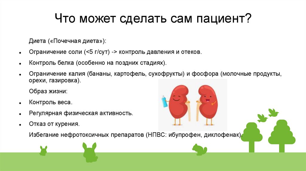 Что может сделать сам пациент?Диета («Почечная диета»):