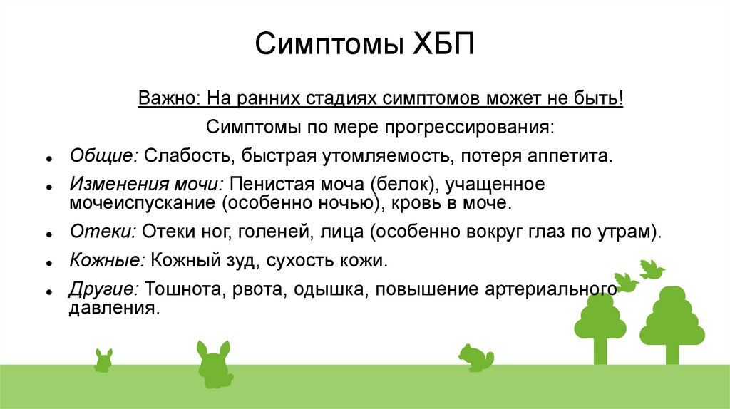 Симптомы ХБПВажно: На ранних стадиях симптомов может не быть!