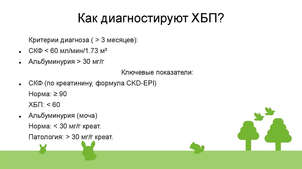 Как диагностируют ХБП?Критерии диагноза ( > 3 месяцев):