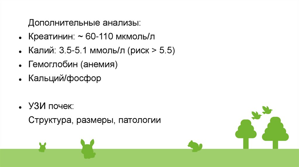 Дополнительные анализы:Креатинин: ~ 60-110 мкмоль/л