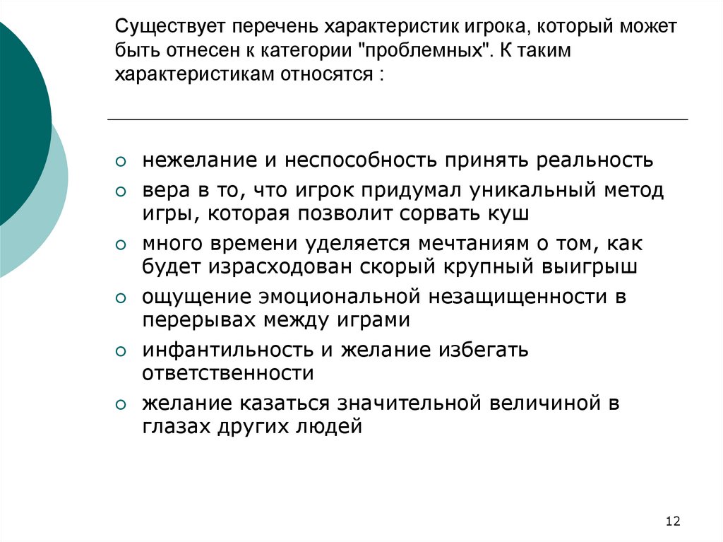 Существует перечень характеристик игрока, который можетбыть отнесен к категории "проблемных". К таким