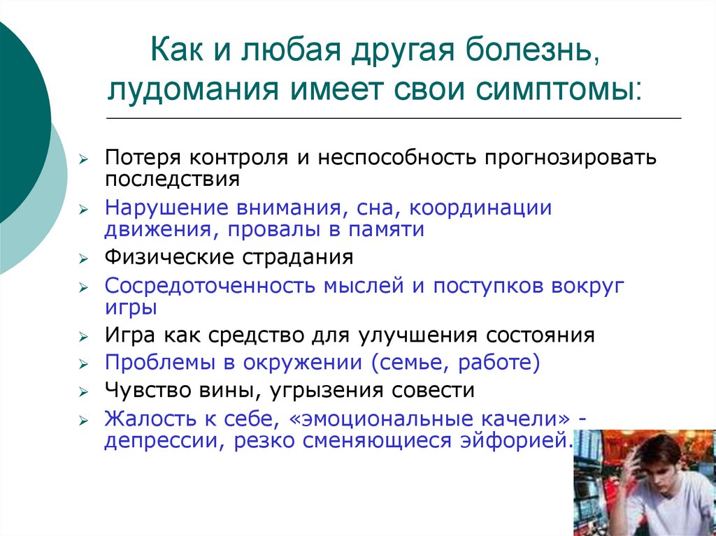 Как и любая другая болезнь,лудомания имеет свои симптомы: