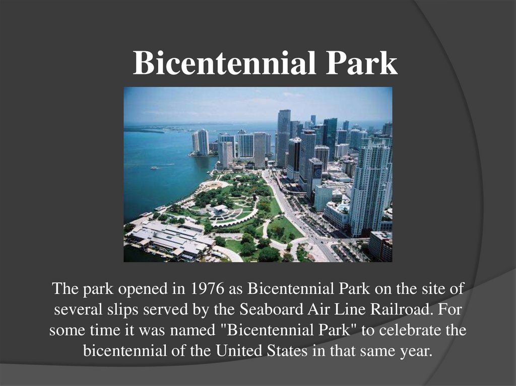 Bicentennial ParkThe park opened in 1976 as Bicentennial Park on the site of