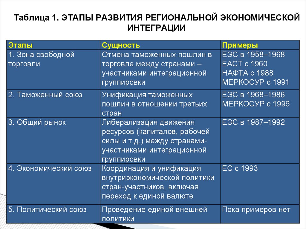 Таблица 1. ЭТАПЫ РАЗВИТИЯ РЕГИОНАЛЬНОЙ ЭКОНОМИЧЕСКОЙИНТЕГРАЦИИ