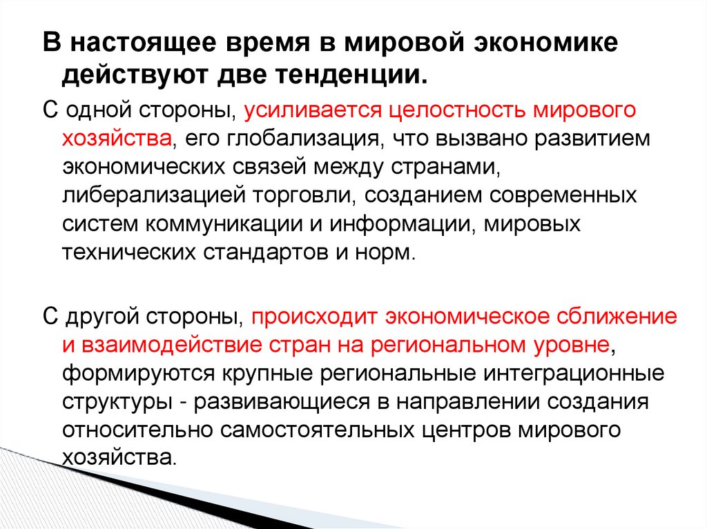 В настоящее время в мировой экономикедействуют две тенденции.