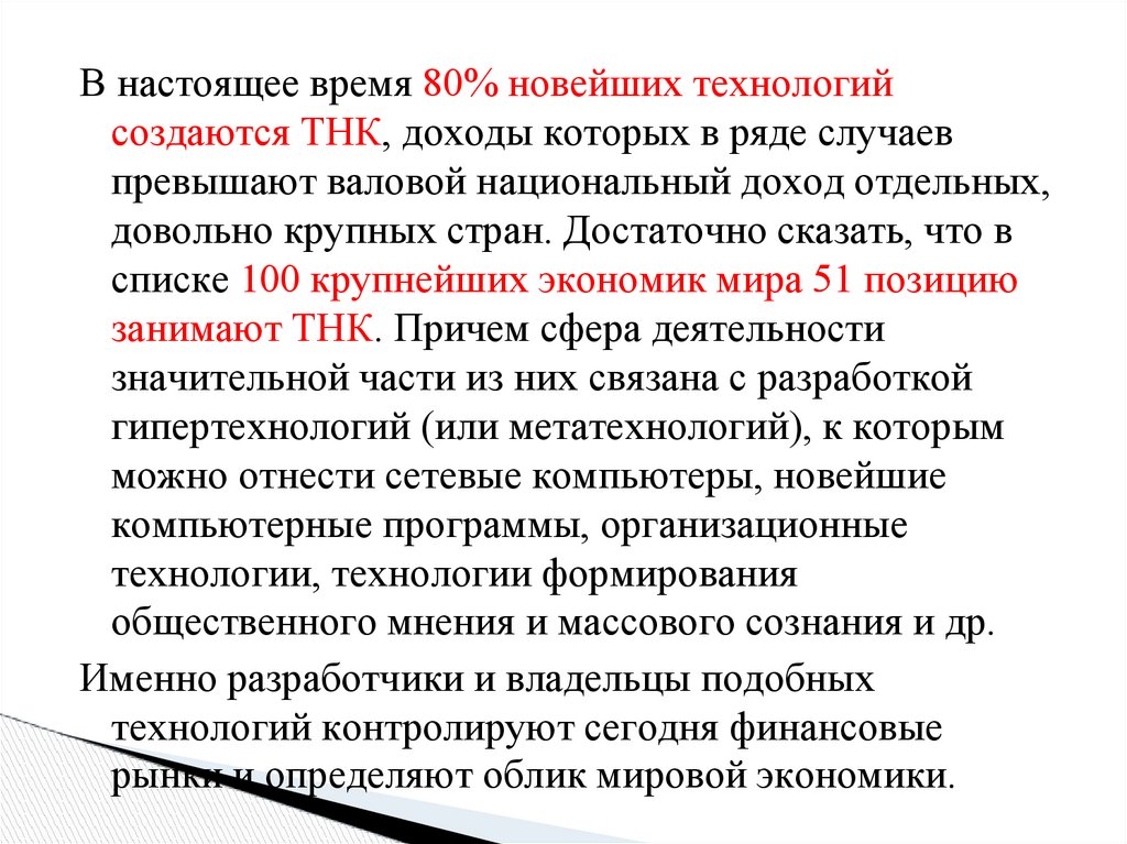 В настоящее время 80% новейших технологийсоздаются ТНК, доходы которых в ряде случаев