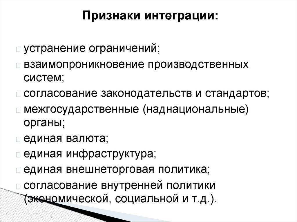 Признаки интеграции:устранение ограничений;