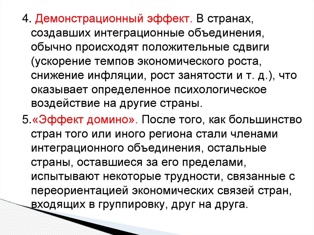 4. Демонстрационный эффект. В странах,создавших интеграционные объединения,