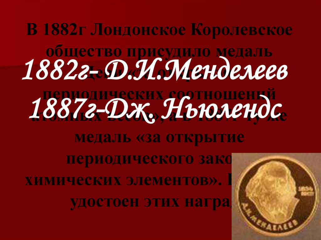 В 1882г Лондонское Королевскоеобщество присудило медаль