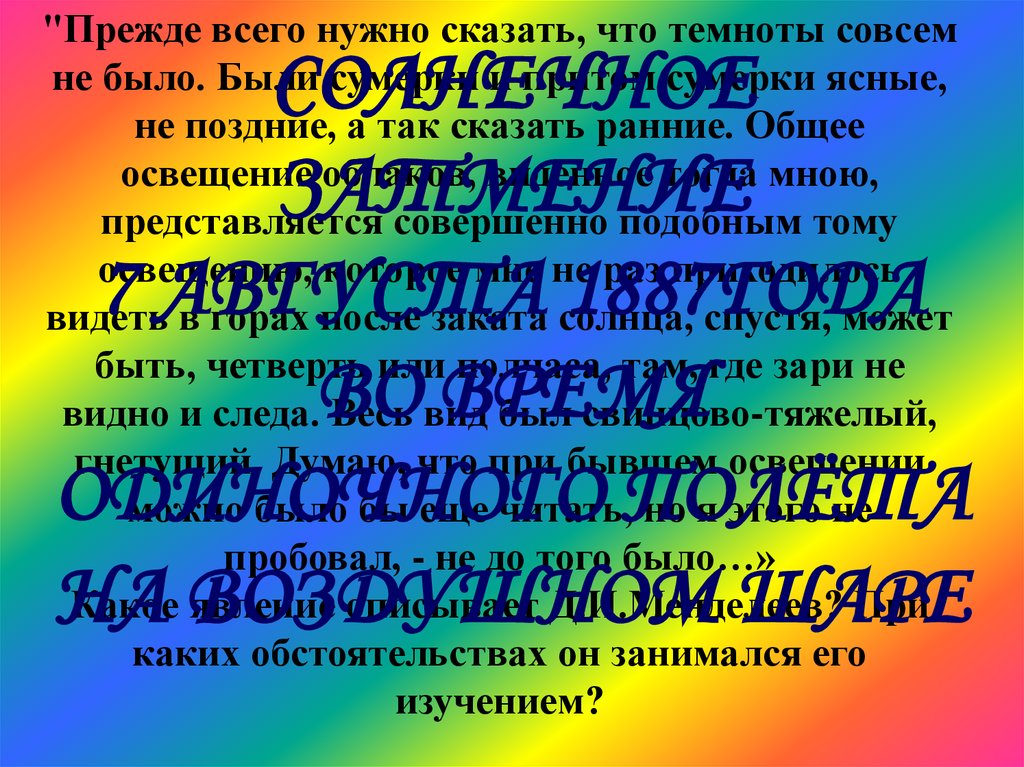 "Прежде всего нужно сказать, что темноты совсемне было. Были сумерки и притом сумерки ясные,
