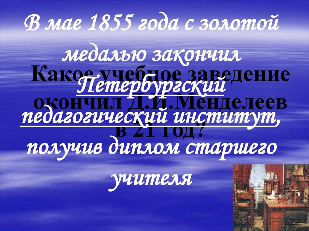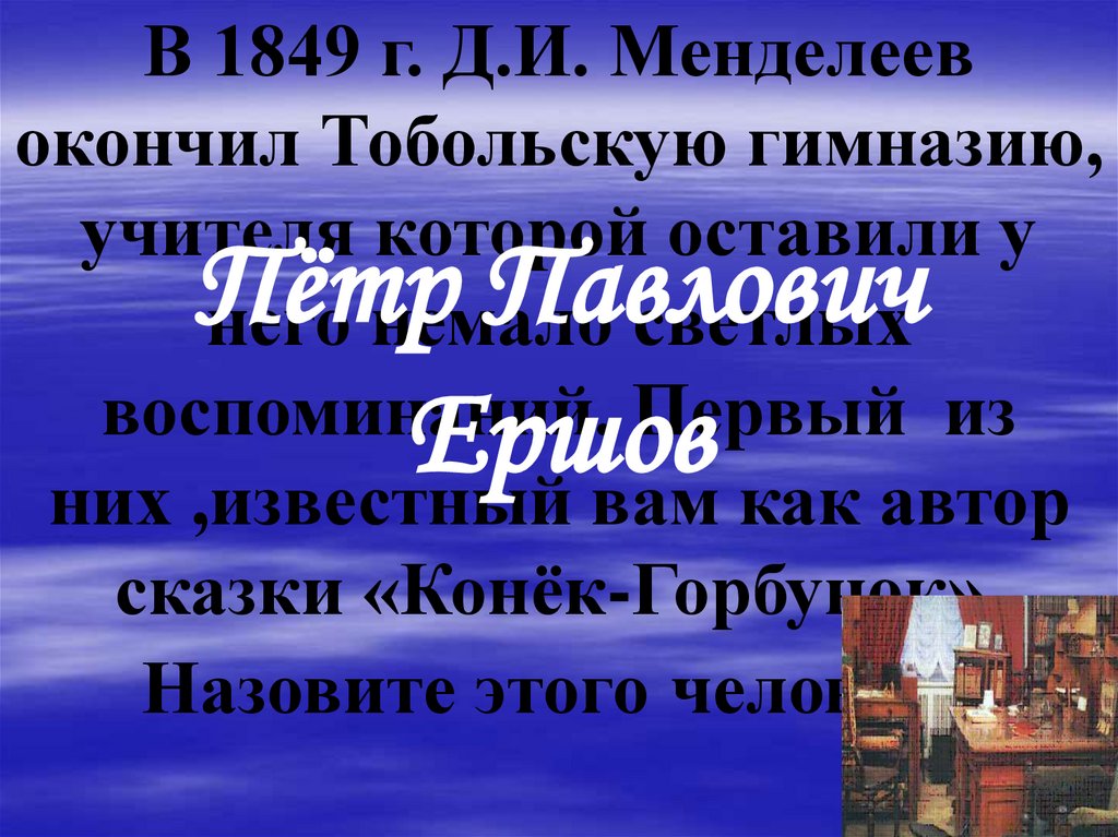 В 1849 г. Д.И. Менделеевокончил Тобольскую гимназию,