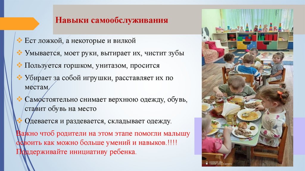 Навыки самообслуживанияЕст ложкой, а некоторые и вилкой