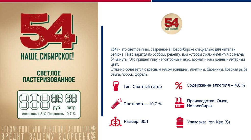 «54» - это светлое пиво, сваренное в Новосибирске специально для жителейрегиона. Пиво варится по особому рецепту, при котором сусло кипятится с хмелем