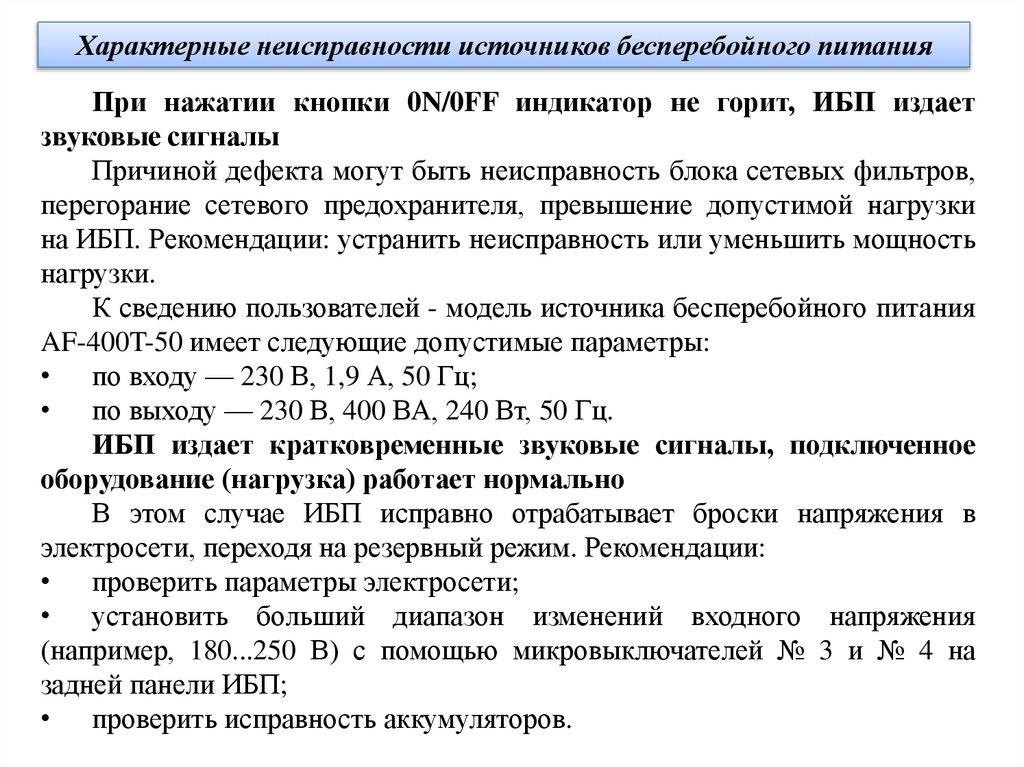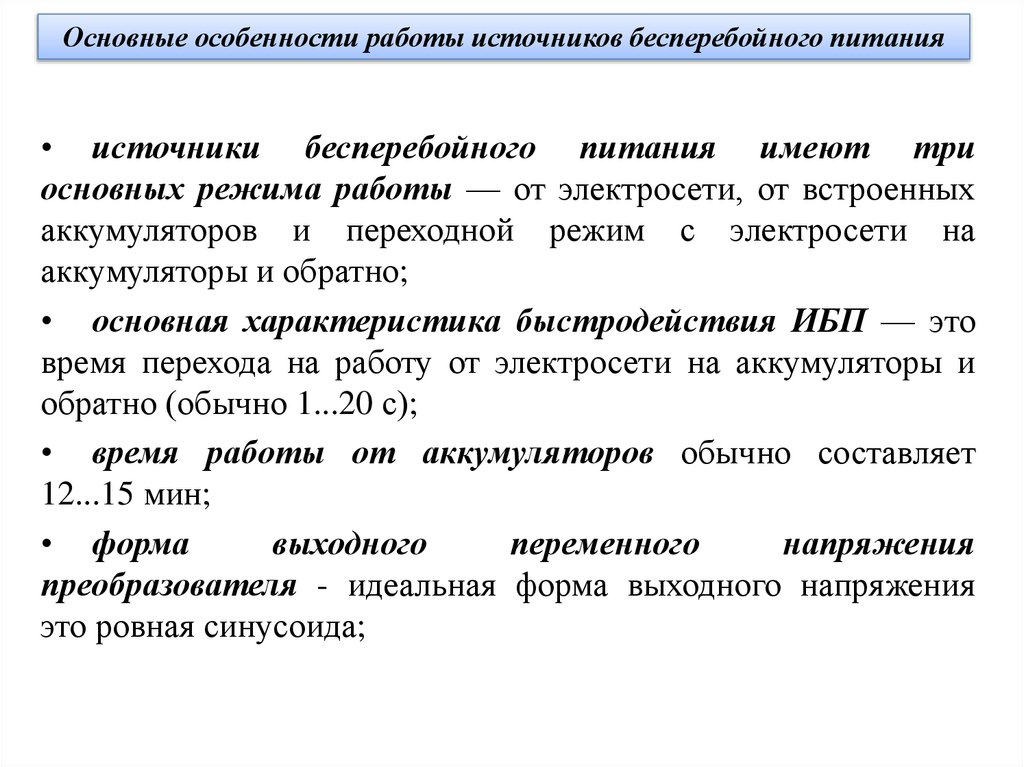 Основные особенности работы источников бесперебойного питания• источники бесперебойного питания имеют три