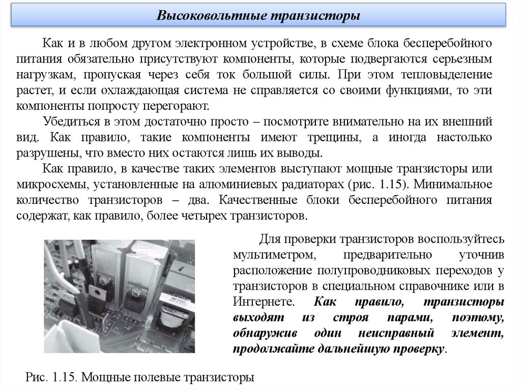 Высоковольтные транзисторыКак и в любом другом электронном устройстве, в схеме блока бесперебойного