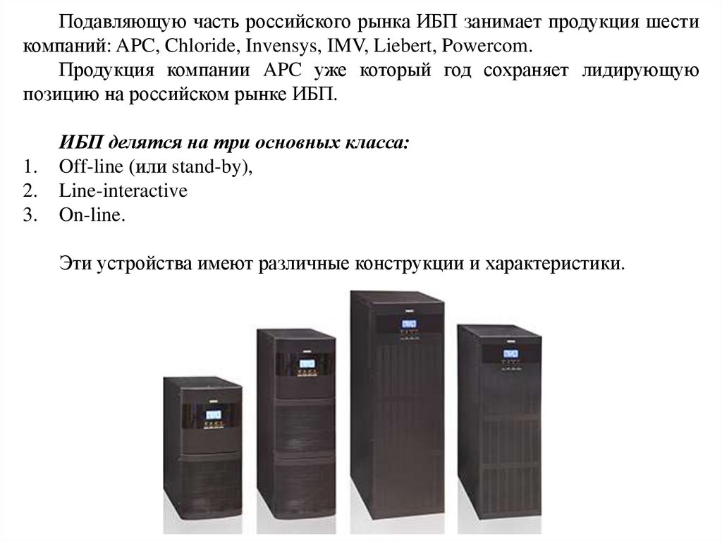 Подавляющую часть российского рынка ИБП занимает продукция шестикомпаний: APC, Chloride, Invensys, IMV, Liebert, Powercom.
