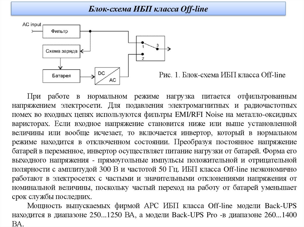 Блок-схема ИБП класса Off-lineРис. 1. Блок-схема ИБП класса Off-line