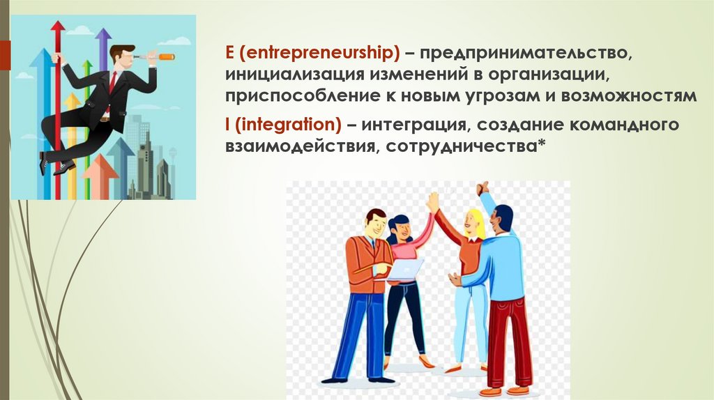 E (entrepreneurship) – предпринимательство,инициализация изменений в организации,