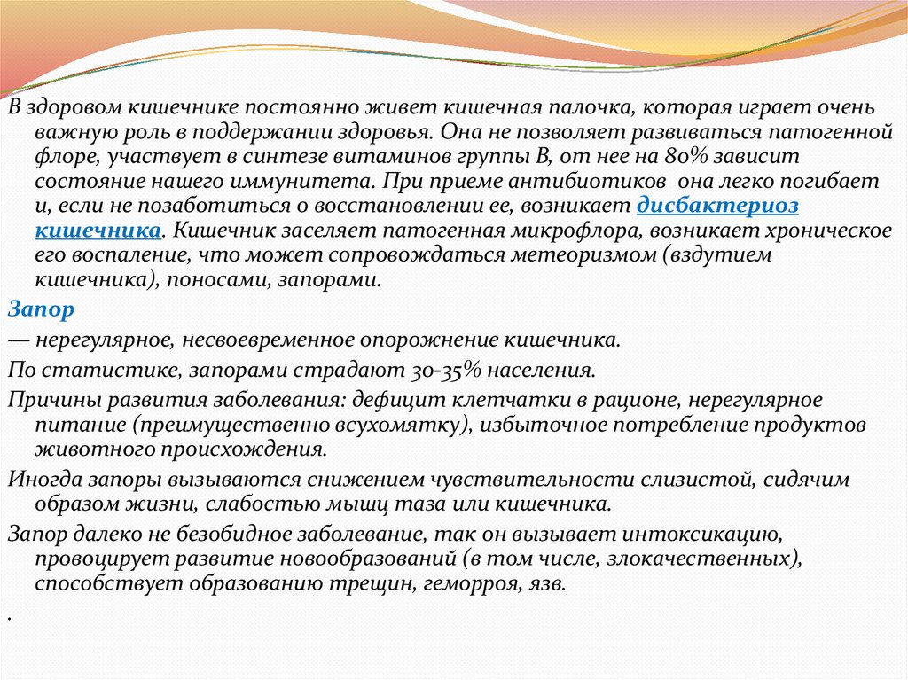 В здоровом кишечнике постоянно живет кишечная палочка, которая играет оченьважную роль в поддержании здоровья. Она не позволяет развиваться патогенной