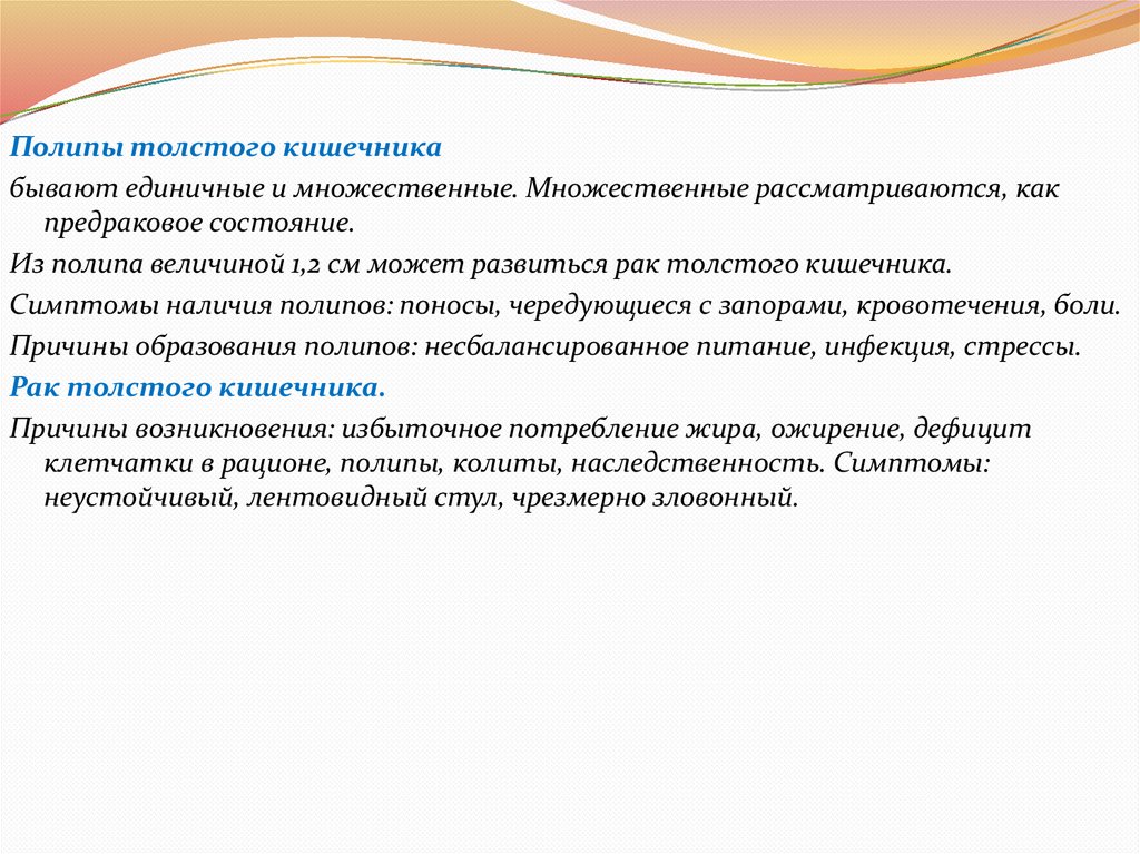 клетчатки в рационе, полипы, колиты, наследственность. Симптомы: