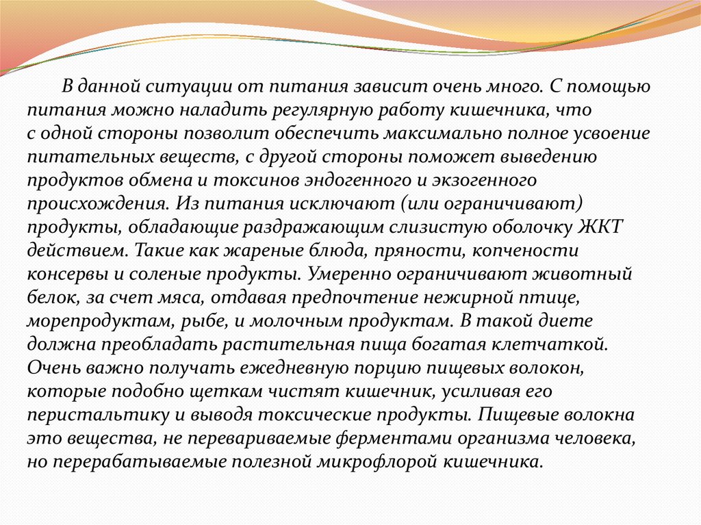 В данной ситуации от питания зависит очень много. С помощьюпитания можно наладить регулярную работу кишечника, что