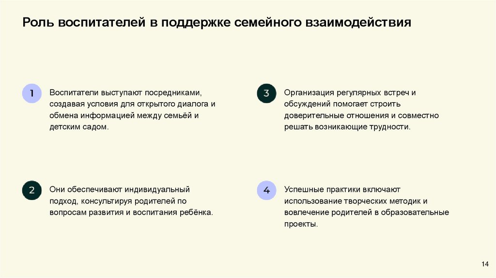 Роль воспитателей в поддержке семейного взаимодействияВоспитатели выступают посредниками,