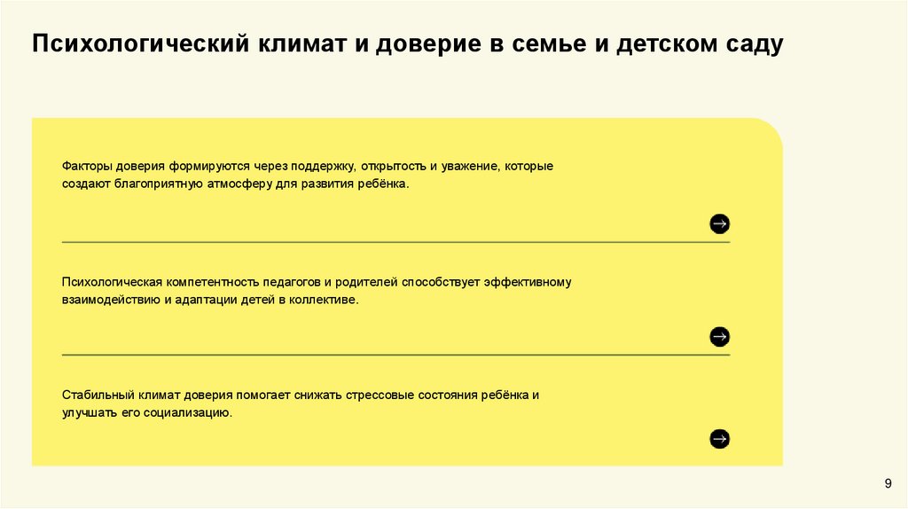 Психологический климат и доверие в семье и детском садуФакторы доверия формируются через поддержку, открытость и уважение, которые