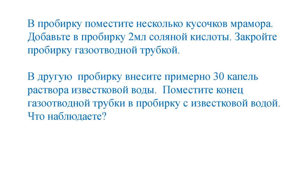 В пробирку поместите несколько кусочков мрамора.Добавьте в пробирку 2мл соляной кислоты. Закройте