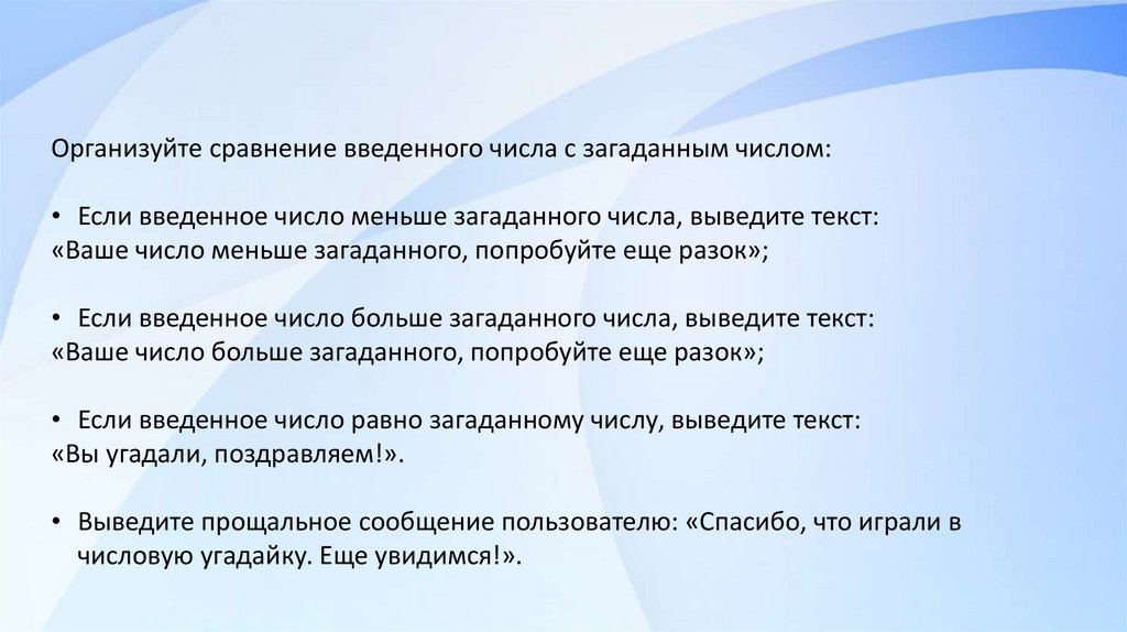 Организуйте сравнение введенного числа с загаданным числом:• Если введенное число меньше загаданного числа, выведите текст: