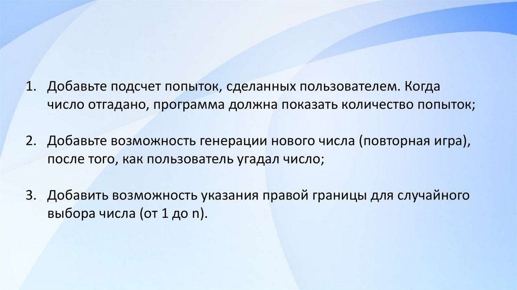 1. Добавьте подсчет попыток, сделанных пользователем. Когдачисло отгадано, программа должна показать количество попыток;