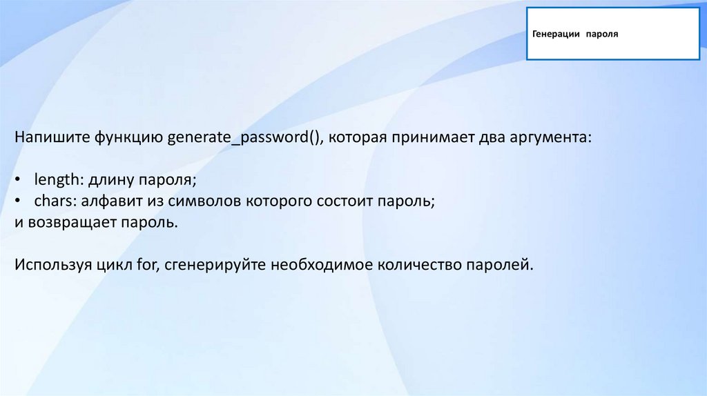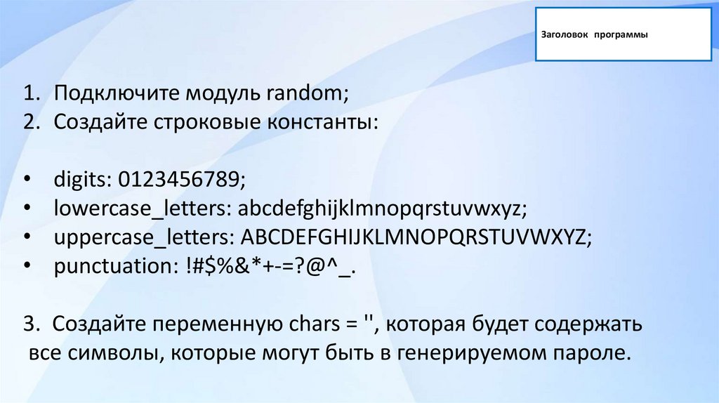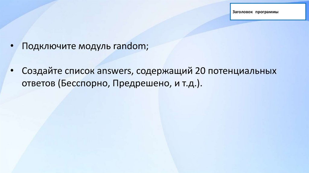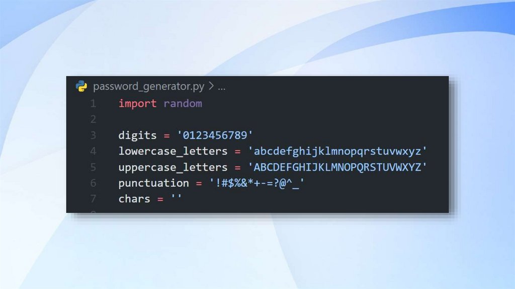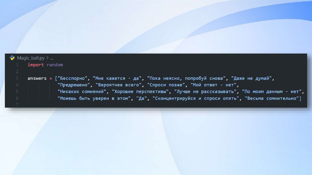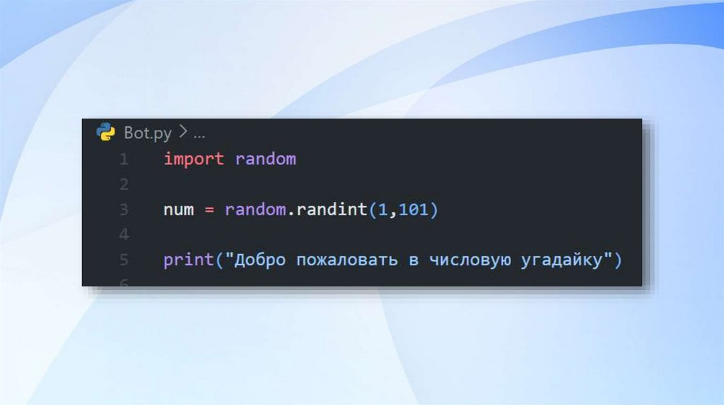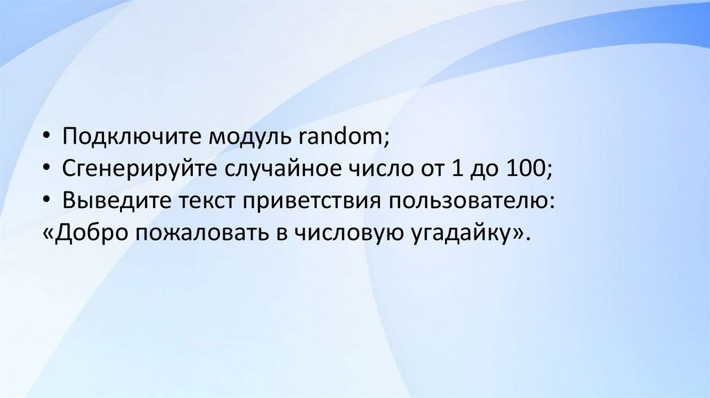 • Подключите модуль random;• Сгенерируйте случайное число от 1 до 100;