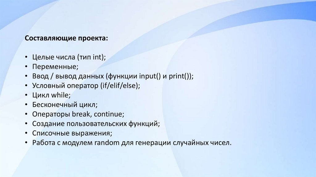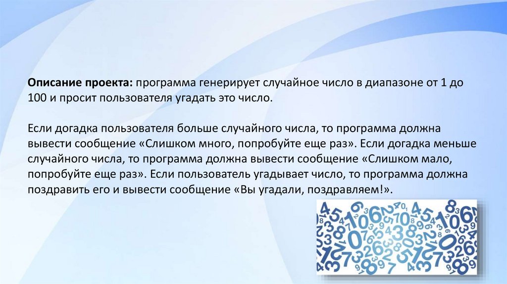 случайного числа, то программа должна вывести сообщение «Слишком мало,