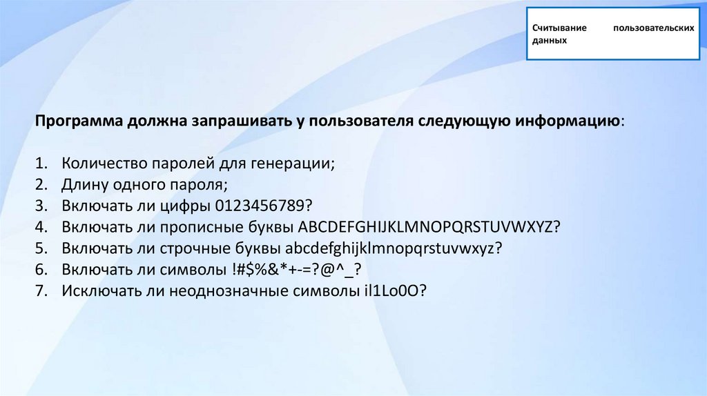 1. Организуйте цикл, который будет запрашивать у пользователя данные (цикл можетбыть бесконечным (while True) или может использовать сигнальную метку с