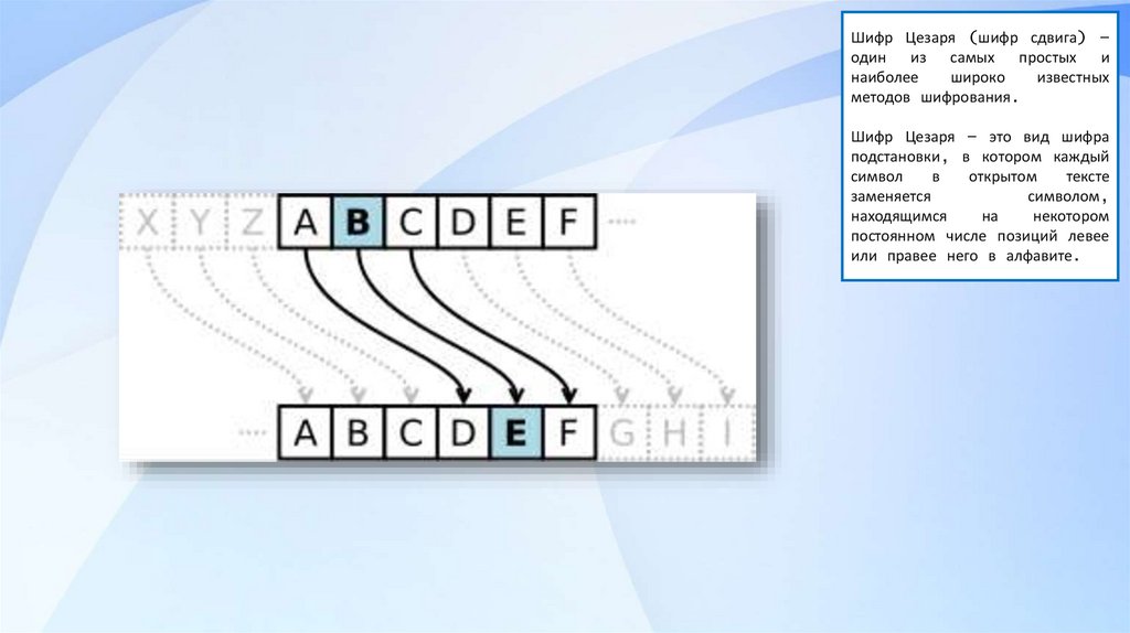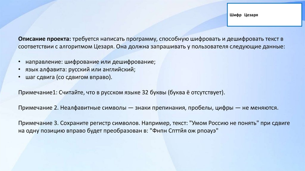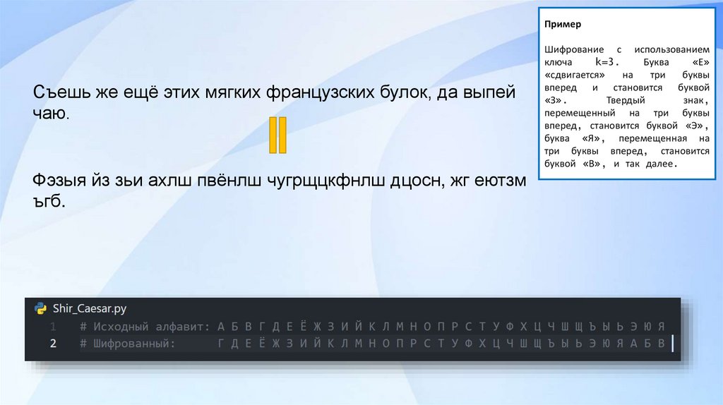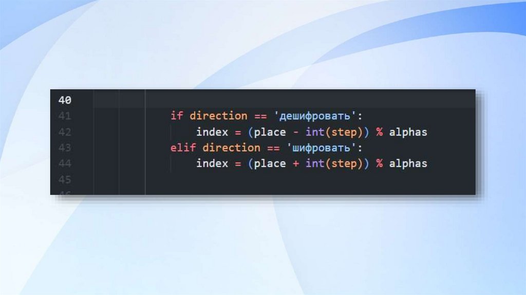 • Новый индекс = Старый индекс + Шаг % Длина алфавита.
