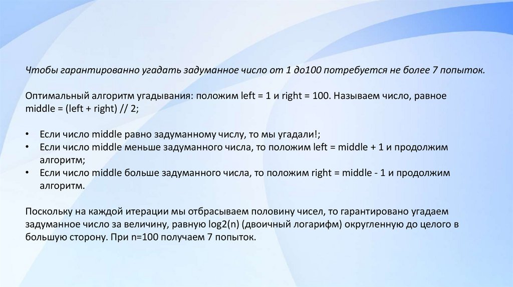 Чтобы гарантированно угадать задуманное число от 1 до100 потребуется не более 7 попыток.Оптимальный алгоритм угадывания: положим left = 1 и right = 100. Называем число, равное