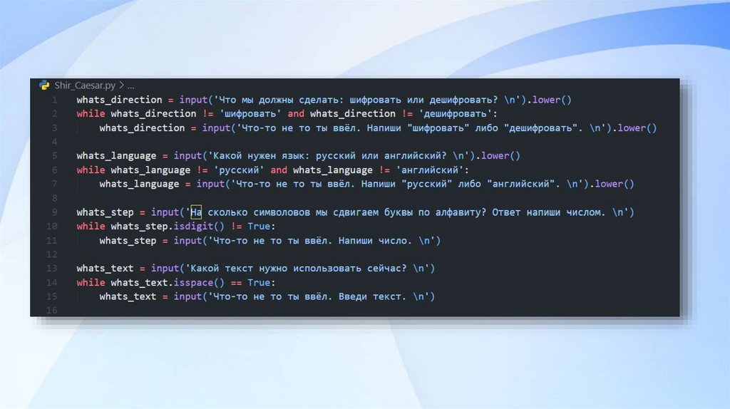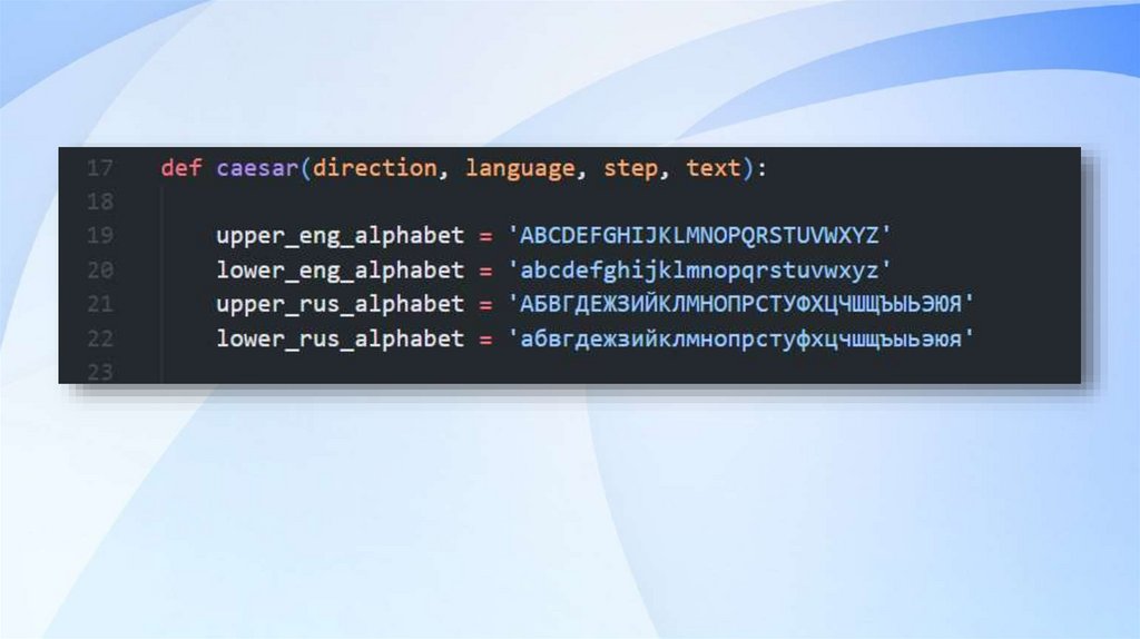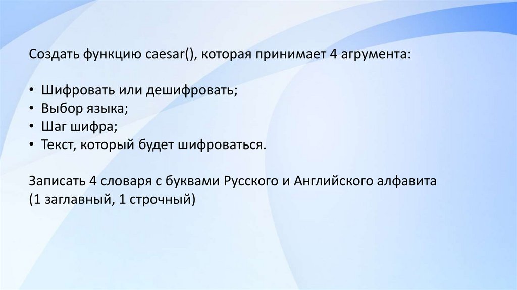 Создать функцию caesar(), которая принимает 4 агрумента:• Шифровать или дешифровать;