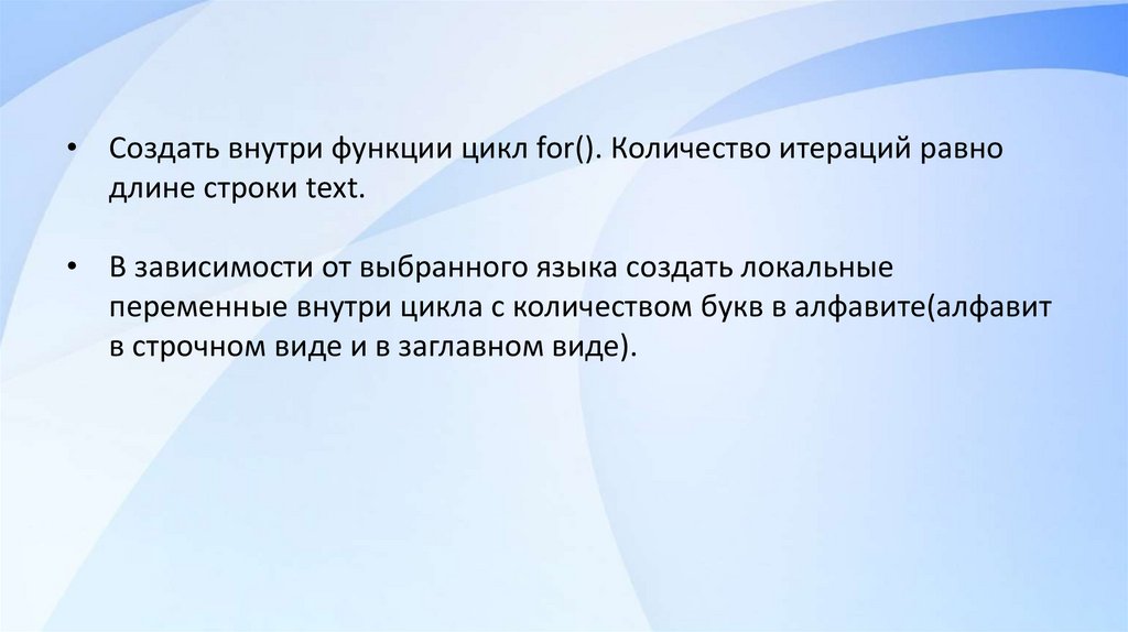 • Создать внутри функции цикл for(). Количество итераций равнодлине строки text.