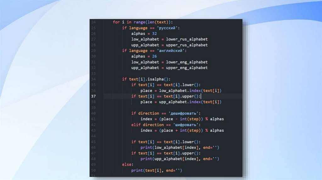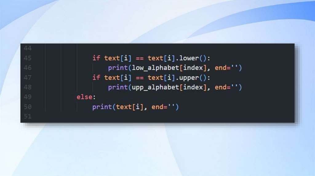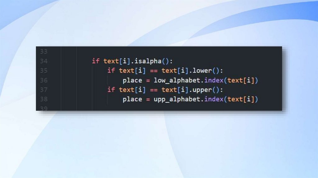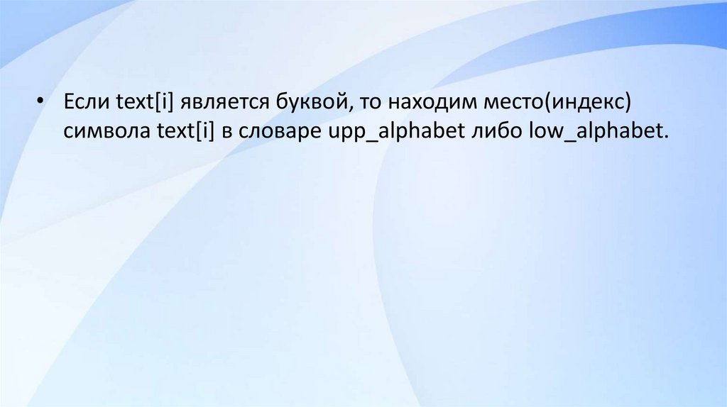 • Если text[i] является буквой, то находим место(индекс)символа text[i] в словаре upp_alphabet либо low_alphabet.