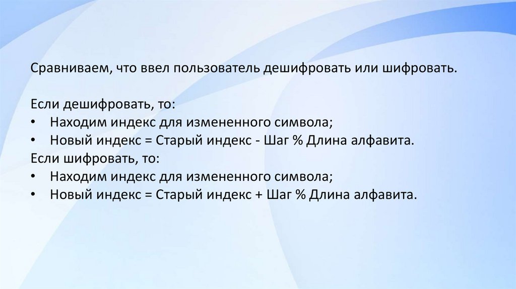 • Новый индекс = Старый индекс - Шаг % Длина алфавита.