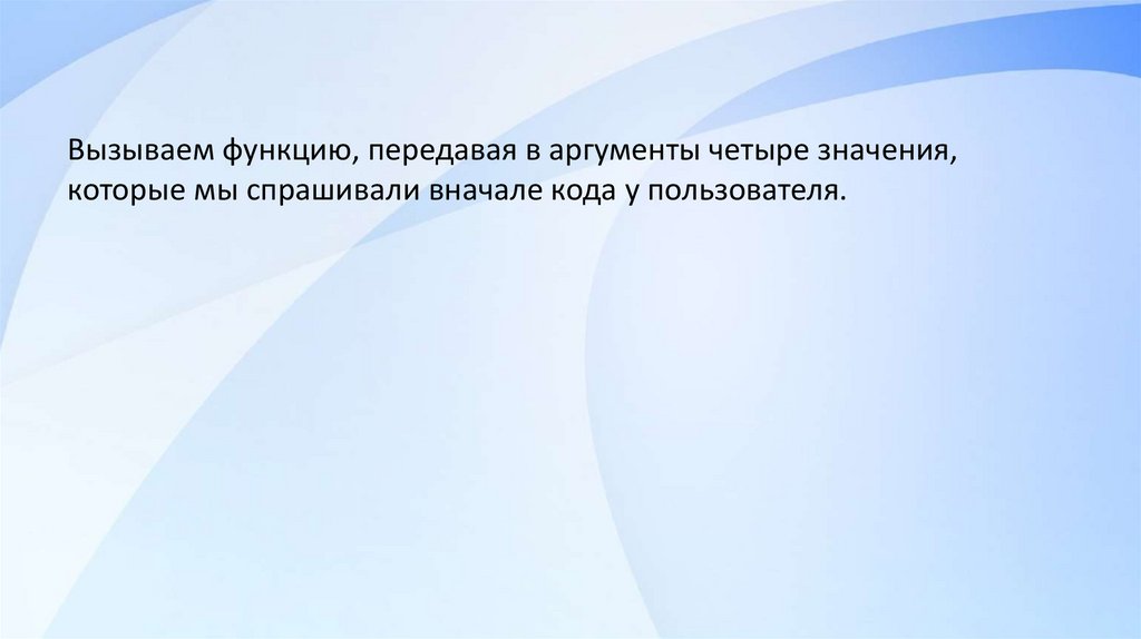 Вызываем функцию, передавая в аргументы четыре значения,которые мы спрашивали вначале кода у пользователя.