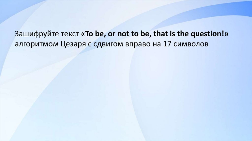 Зашифруйте текст «To be, or not to be, that is the question!»алгоритмом Цезаря с сдвигом вправо на 17 символов