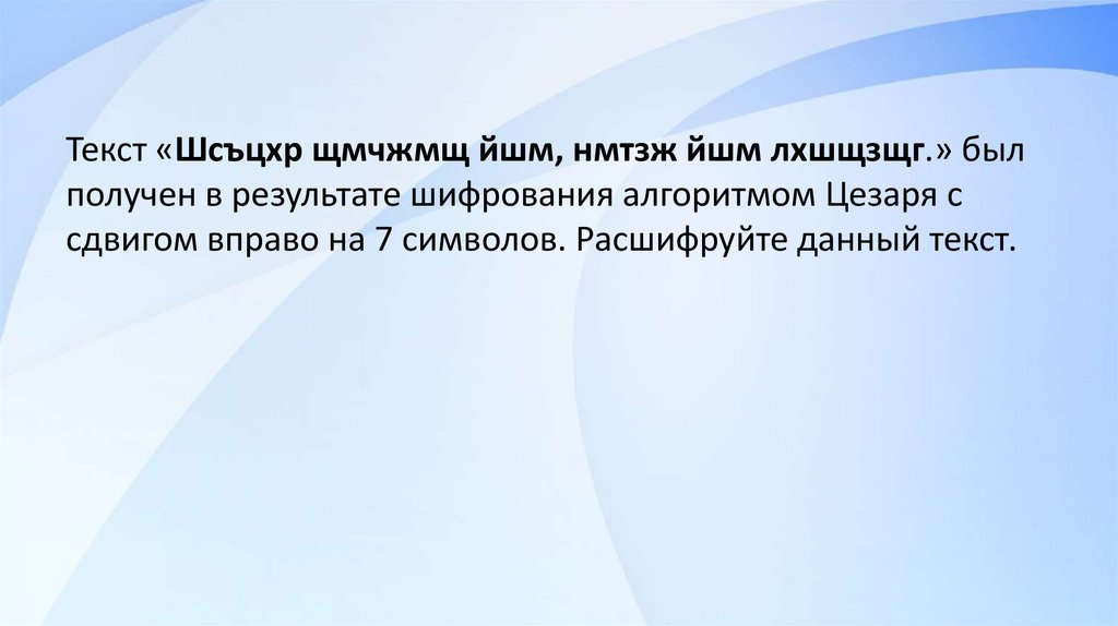 сдвигом вправо на 7 символов. Расшифруйте данный текст.