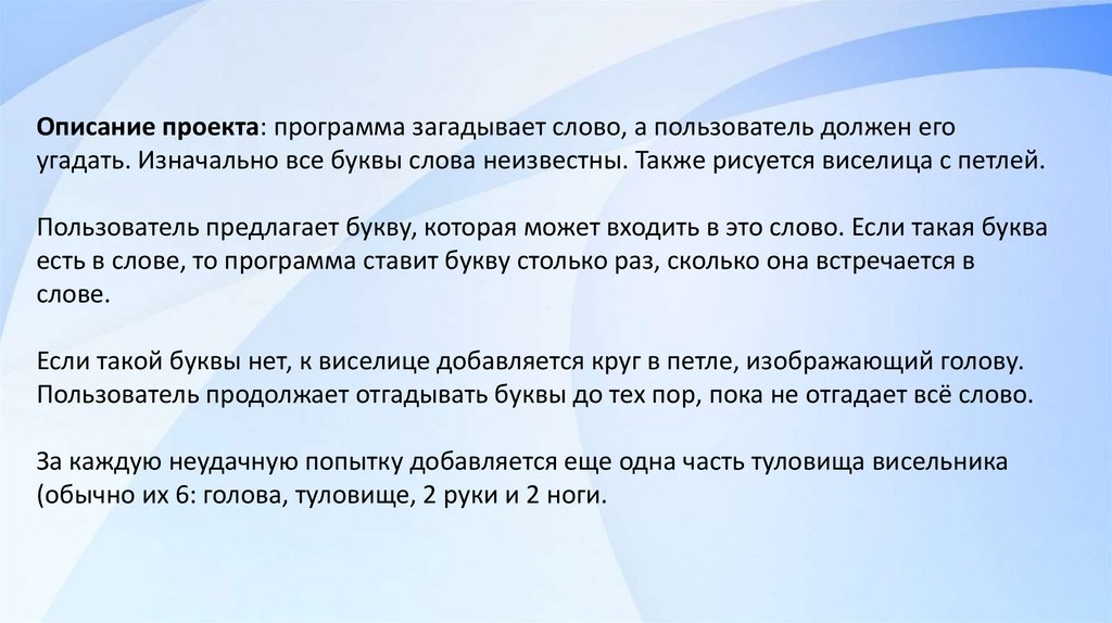 Описание проекта: программа загадывает слово, а пользователь должен егоугадать. Изначально все буквы слова неизвестны. Также рисуется виселица с петлей.