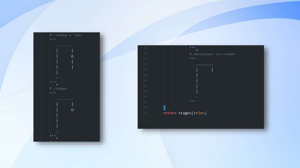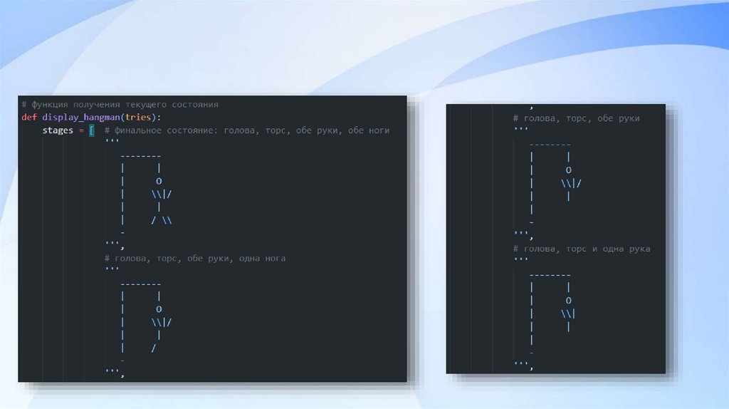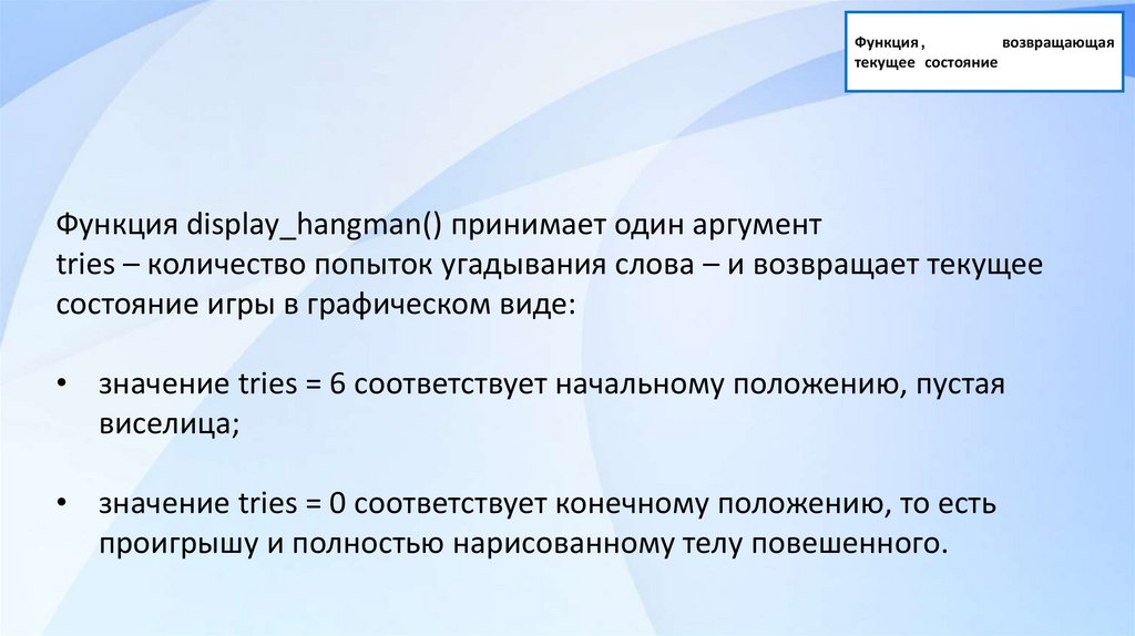 display_hangman() с начальным количеством допустимых промахов tries = 6;