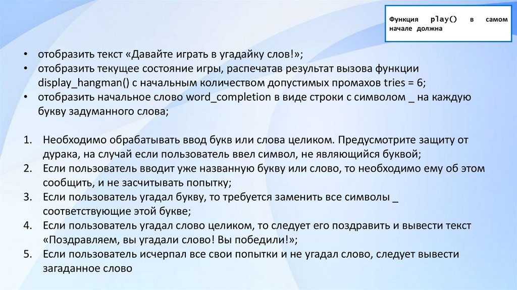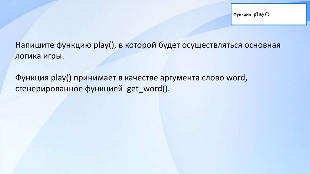 Функция play()Напишите функцию play(), в которой будет осуществляться основная