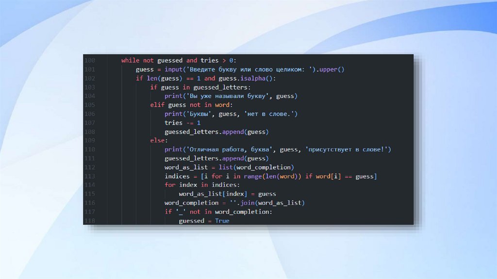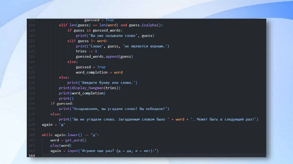 Пользователь продолжает отгадывать буквы до тех пор, пока не отгадает всё слово.