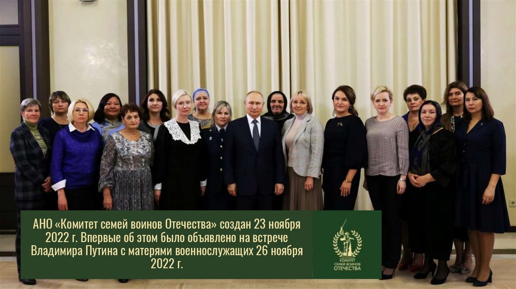 АНО «Комитет семей воинов Отечества» создан 23 ноября2022 г. Впервые об этом было объявлено на встрече