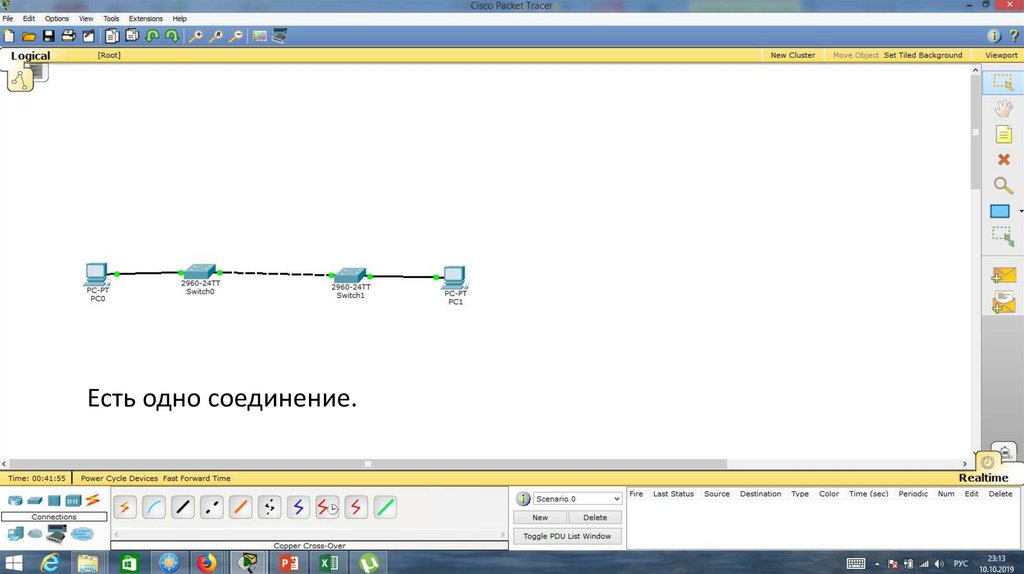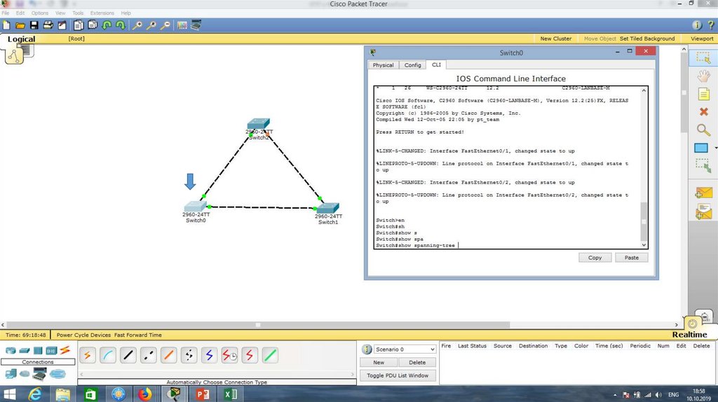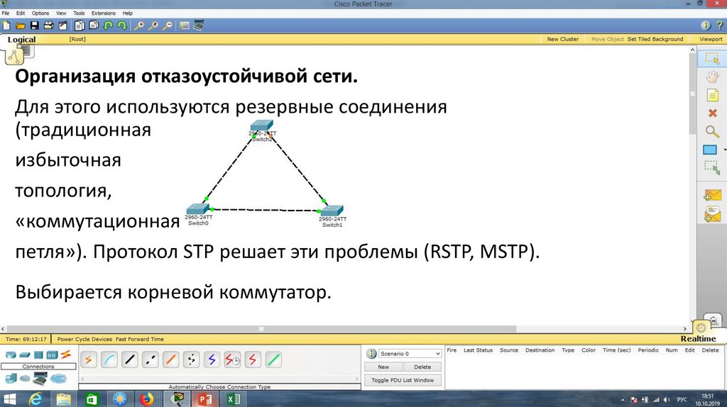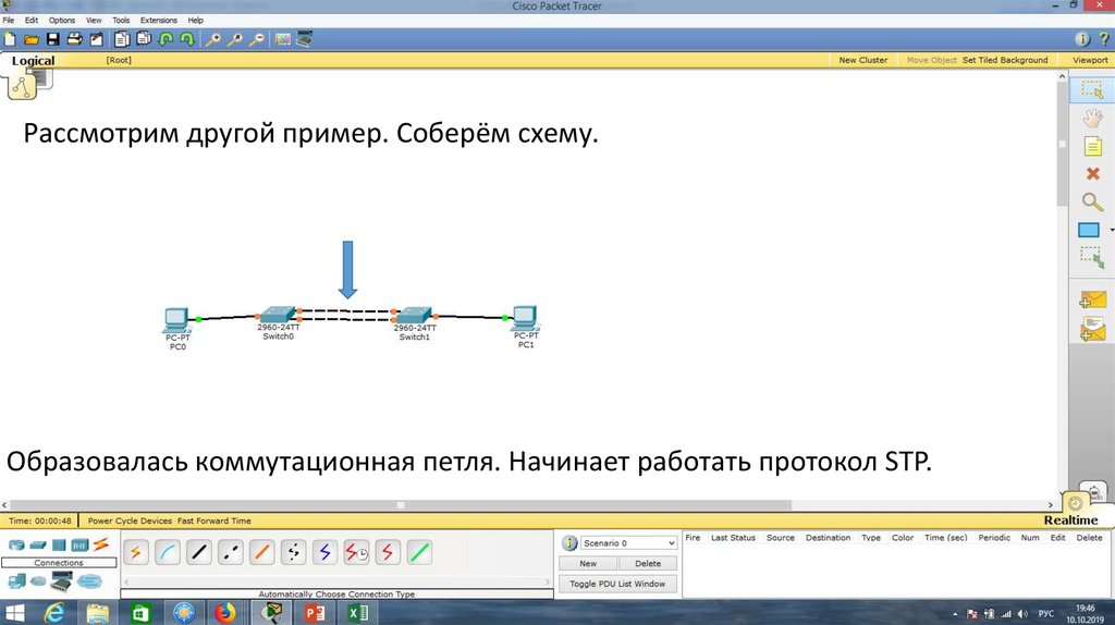 Рассмотрим другой пример. Соберём схему.Образовалась коммутационная петля. Начинает работать протокол STP.