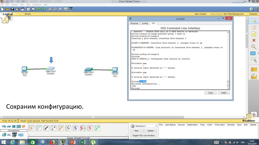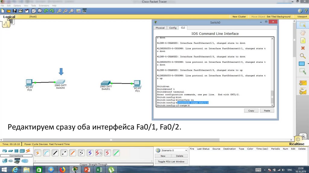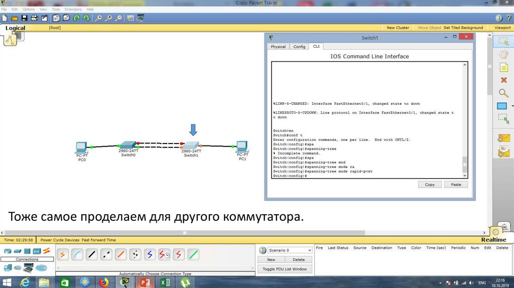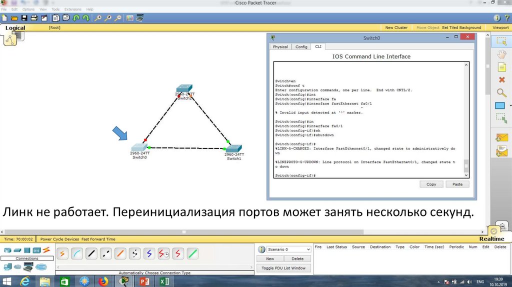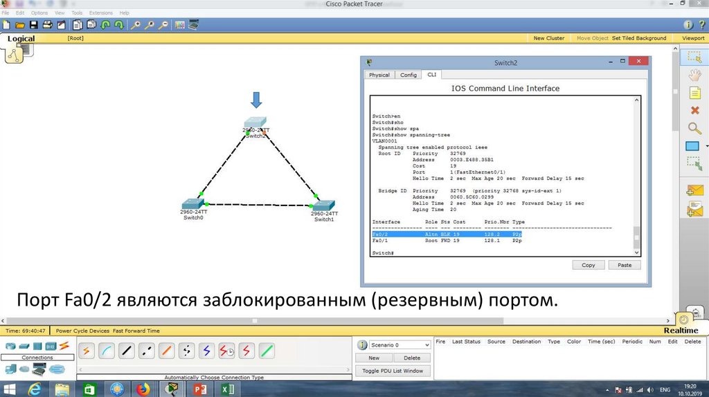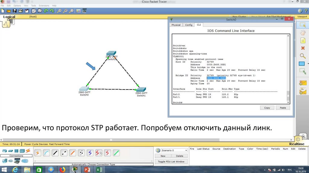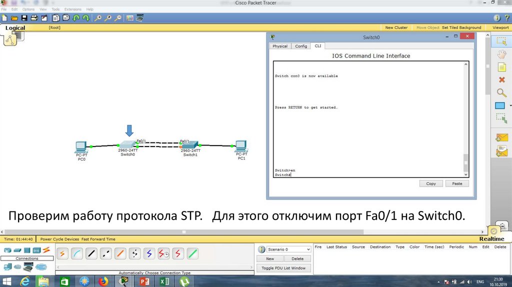 Проверим работу протокола STP. Для этого отключим порт Fa0/1 на Switch0.22.